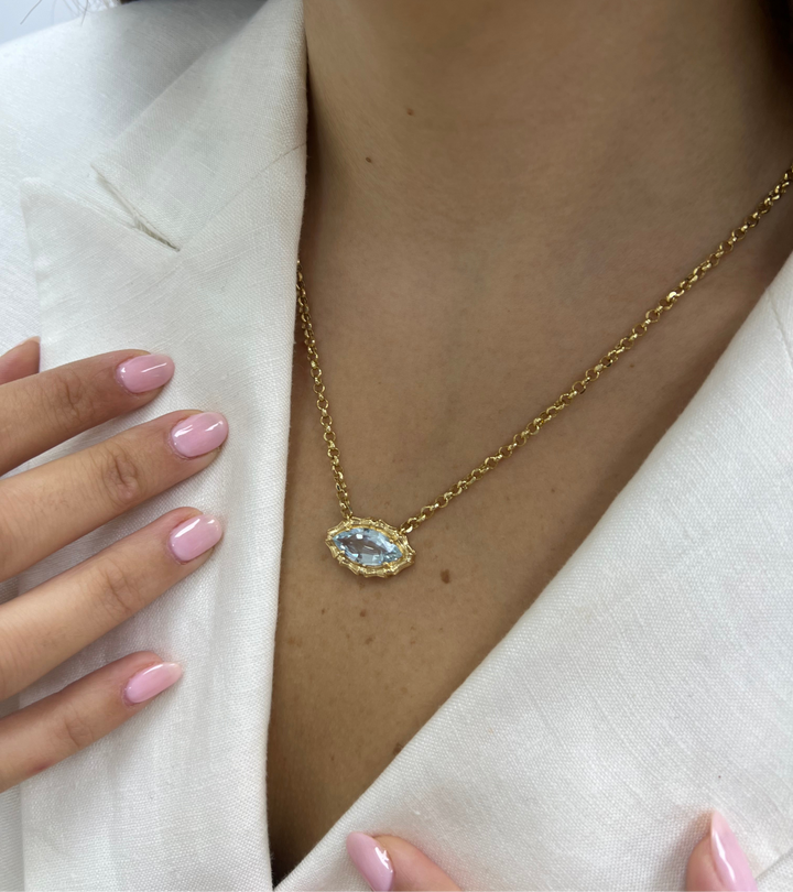 Featuring a 2.40ct Aquamarine marquise, this bamboo inspired necklace is a show stopper. The rolo chain gives it just the right elegance. Necklace can be customized with different gemstones and shapes.
