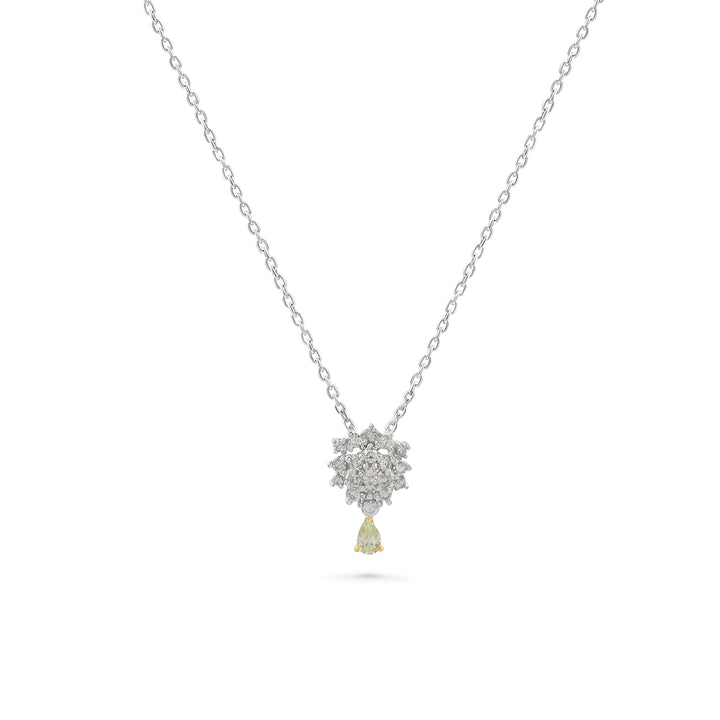 An elegant necklace with white diamonds in a delicate flower shape, with a yellow diamond drop for a special touch.