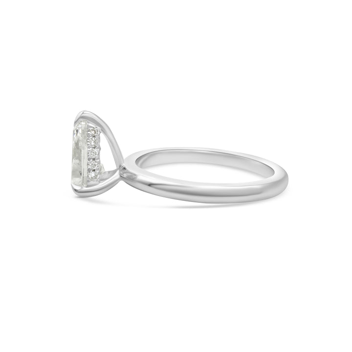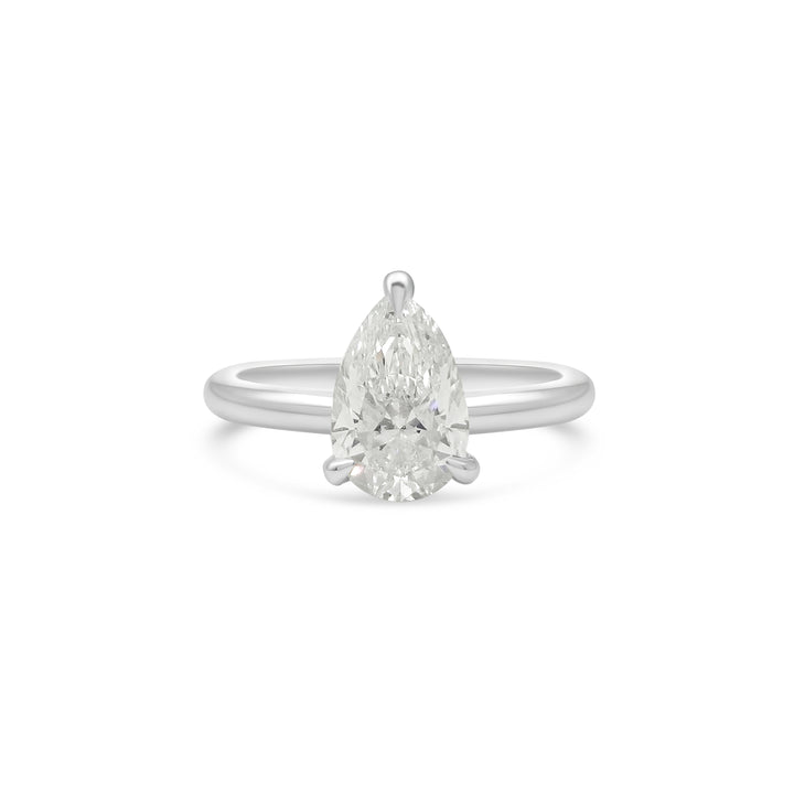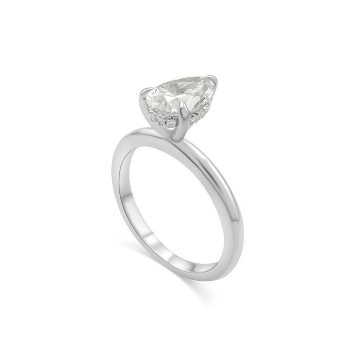 An exquisite pear-shaped solitaire anchored by a 1.20 ct D color diamond, certified by GIA for uncompromising brilliance. Set in 18k gold with a concealed halo that whispers elegance beneath the stone. Perfect for those who favor quiet luxury and impeccable design.