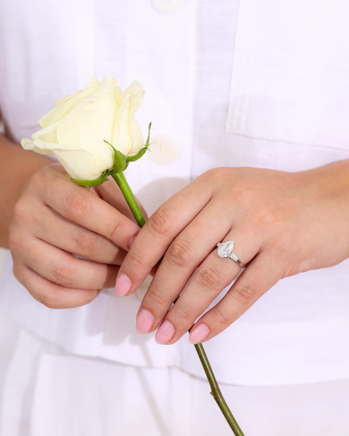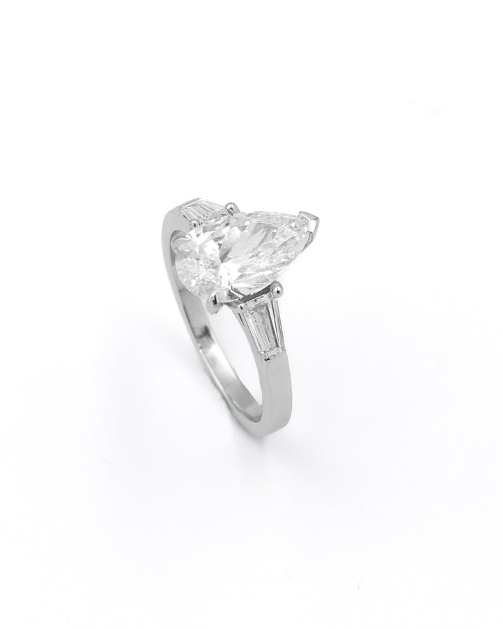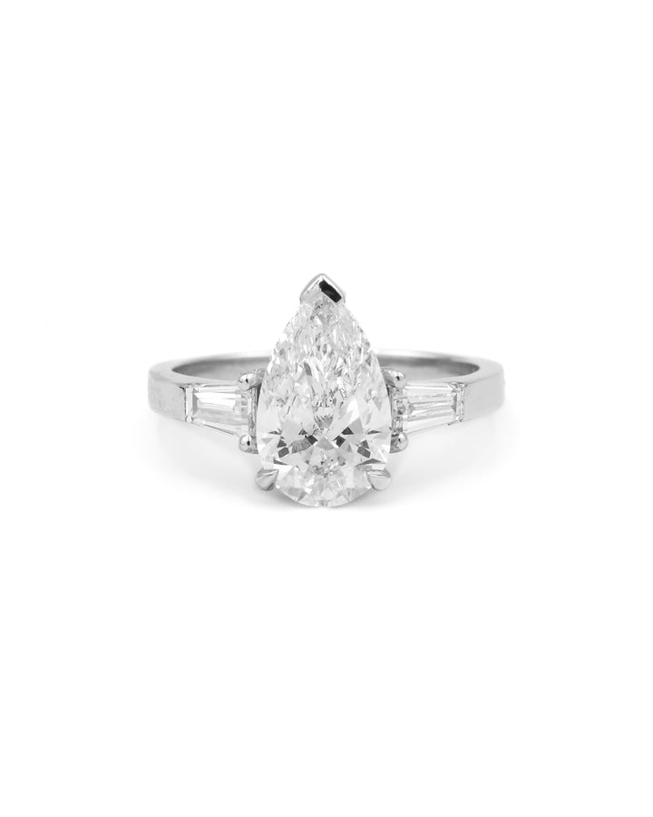 Introducing the Trilogy Solitaire—a masterpiece of refined elegance. This stunning design features a luminous 2.50-carat pear-shaped diamond as its crowning jewel, gracefully flanked by 0.60 carats of tapered baguette diamonds that amplify its radiance. Each element is meticulously positioned to create a harmonious composition that speaks to the discerning woman who understands true luxury. A timeless declaration of sophistication and grace.