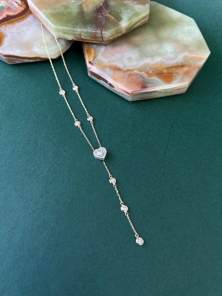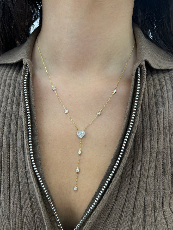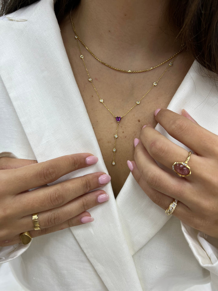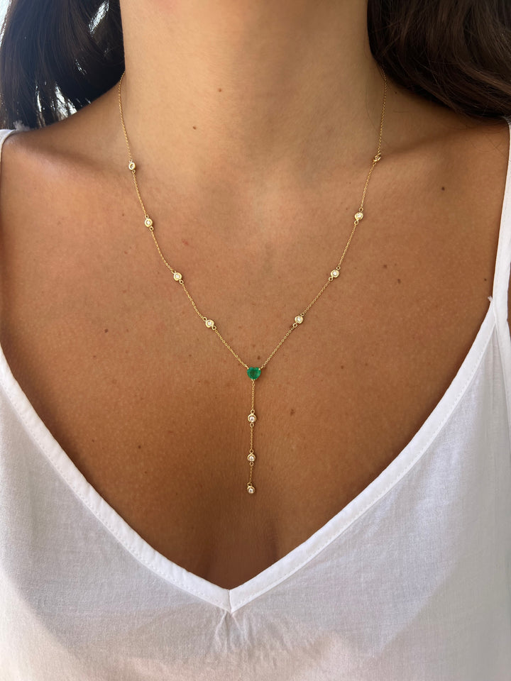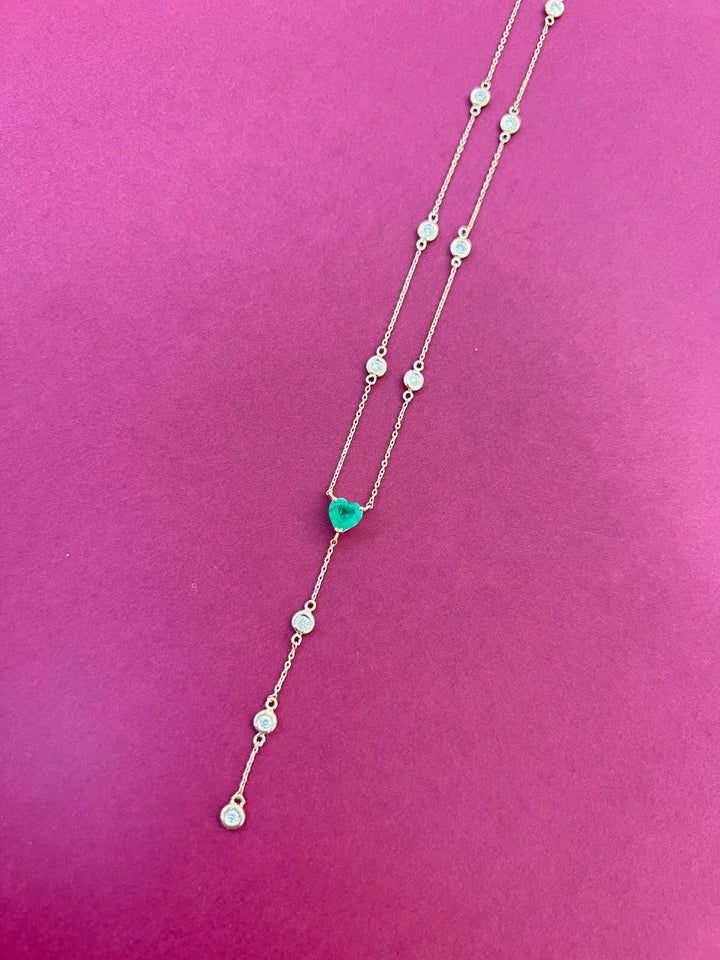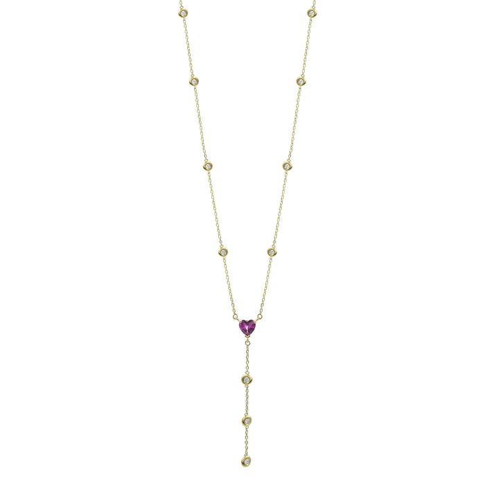 A lariat with diamonds and a heart colored gemstone for the perfect pop of color. The lariat can be customized with any heart gemstone, the price will vary depending on the choice.